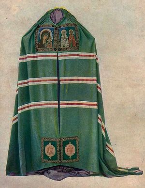 — Куколь, епитрахиль и мантию со скрижалями вышивали насельницы московских женских монастырей, а также Императрица Александра Феодоровна. В частности, изображение Серафимов на куколе выполнила именно она, а также обнизала их жемчугом. На длинных воскрилиях куколя располагались восемь дробниц с изображениями святителей и покровителей Царской семьи. На бархатной епитрахили были изображены образы московских святителей Петра, Ионы, Алексия и Филиппа, окруженные узором из жемчуга. И еще одна интересная подробность — шелковая мантия серо-серебристого цвета была украшена скрижалями, шитыми шелком и золотом: на одной был вышит Казанский образ Богоматери, на другой — тезоименитые священномученику Гермогену святые — мученик Гермоген и священномученик Ермолай. Внизу на мантию прикрепили круглые медальоны с именем Патриарха.