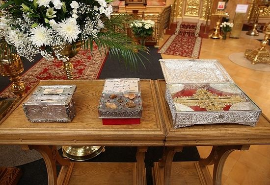 Для всеобщего поклонения доступны частица Животворящего Креста Господня и ковчеги с мощами Сербских святых: святого великомученика Георгия Ново-Кратовского, мученика, пострадавшего за веру во времена турецкого владычества на Балканах; святого великомученика князя Лазаря, заботившегося о монастырях, защитника сербских земель от междоусобиц и турецких набегов; святого царя Стефана Уроша Пятого, объединителя сербских земель, защитника и покровителя Церкви и монастырей, последнего князя из рода Неманичей; святого праведного князя Стефана Штильяновича, защитника веры; святых преподобомучеников Превлака из монастыря святого Архангела Михаила, погибших от предательства венецианцев; преподобной Анастасии, матери святого Саввы Сербского.