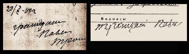 Подпись арестованного священника Павла Троицкого при аресте 29 октября 1937 года и в ту же ночь после допроса