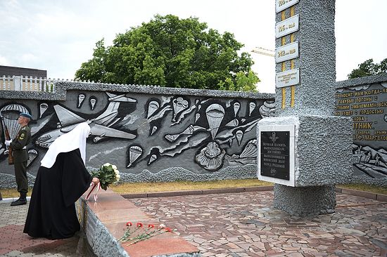 Святейший Патриарх возложил цветы к стеле выпускников, погибших при исполнении воинского долга, расположенной на территории мемориального комплекса «Аллея героев». Была пропета «Вечная память».