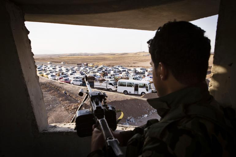 Солдат иракских сил безопасности смотрит на машины беженцев, скопившиеся на границе с иракским Курдистаном в Ибриле. REUTERS/Jacob Russell