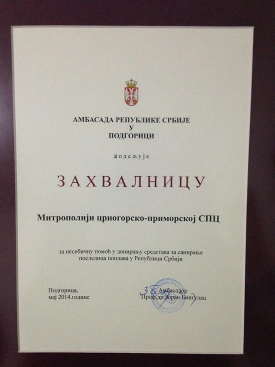 Амбасадор Србије у Подгорици Његова екселенција Господин Зоран Бингулац данас је уручио захвалницу Амбасаде Митрополији црногорско-приморској за помоћ угроженима од недавних поплава у Србији.