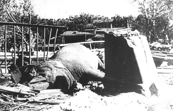 Убитый слон в Ленинградском зоопарке – это слониха Бетти, которую не успели эвакуировать из Ленинграда. Во время бомбежек слониха, едва услышав звуки сирены, поспешно отправлялась в свой домик. Восьмого сентября 1941 года рядом с ее вольером разорвалась одна из трех фугасных бомб, сброшенных с немецкого бомбардировщика. Бомба убила сторожа и смертельно ранила саму Бетти. Ее похоронили на территории зоопарка. Тем не менее, сотрудники зоопарка сделали то, что сейчас кажется совершенно невероятным. Не получая никакой помощи, они смогли сохранить жизни 160-ти животным и птицам, которые пережили блокаду и свидетельствовали тысячам посетителей Ленинградского зоопарка о торжестве Жизни над смертью.