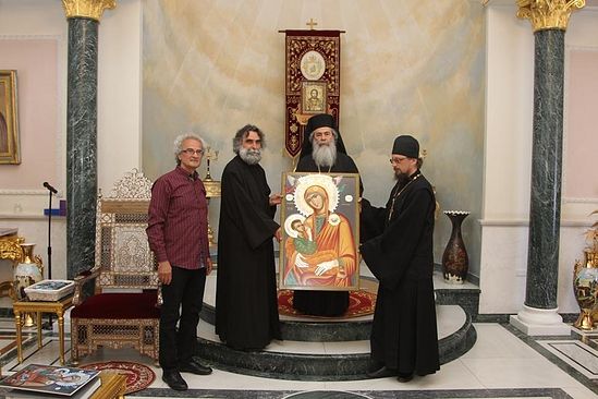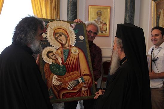 Ову икону је, према оригиналу који се налази у келији Светог Саве у Кареји, живописао Душан Ракинац, а Јерусалимском Патријарху су овај велики дар, као израз љубави и поштовања српског народа, уручили старешина храма Светог Саве у Београду протојереј-ставрофор Радивој Панић и уметник Миша Бранковић, који је и заслужан за организацију израде и поклоничког пута ове иконе.