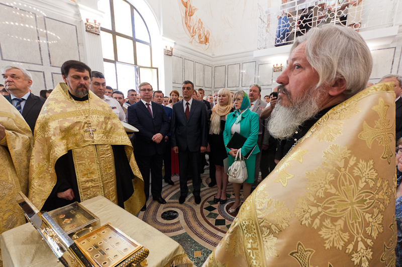 За час до этого события в храм Архистратига Божия Михаила были навечно переданы список с чудотворной Иверской иконы Божией Матери и ковчег с частицами мощей святых отцов Глинской пустыни. Перед этими драгоценными дарами благочинный Севастопольского округа протоиерей Сергий Халюта в сослужении севастопольского духовенства отслужил благодарственный молебен. Прихожанами гарнизонного храма Черноморского флота – офицерами и моряками ЧФ, севастопольцами и гостями города была вознесены молитвы Господу нашему Иисусу Христу и Его Пречистой Матери о ниспосланной милости – воссоединении Севастополя и Крыма с Россией.