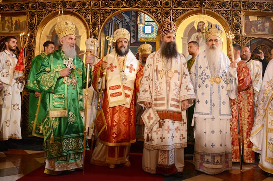 Његовој Светости су, уз новоустоличеног Митрополита, саслуживали митрополити аркадијски Василије из Антиохијске Патријаршије и црногорско-приморски Амфилохије, Преосвећена господа епископи: карпасијски г. Христофор из Кипарске Архиепископије, бачки Иринеј, изабрани жички Јустин, аустралијско-новозеландски Иринеј и изабрани аустријско-швајцарски Андреј.