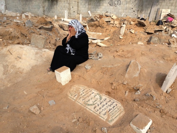She continues to dig down, deeper into his grave, still crying - a mother coming here alone with Israeli warplanes dropping bombs overhead. Just some hours ago, the Sheikh Radwan cemetery was hit by missiles from Israeli jets.