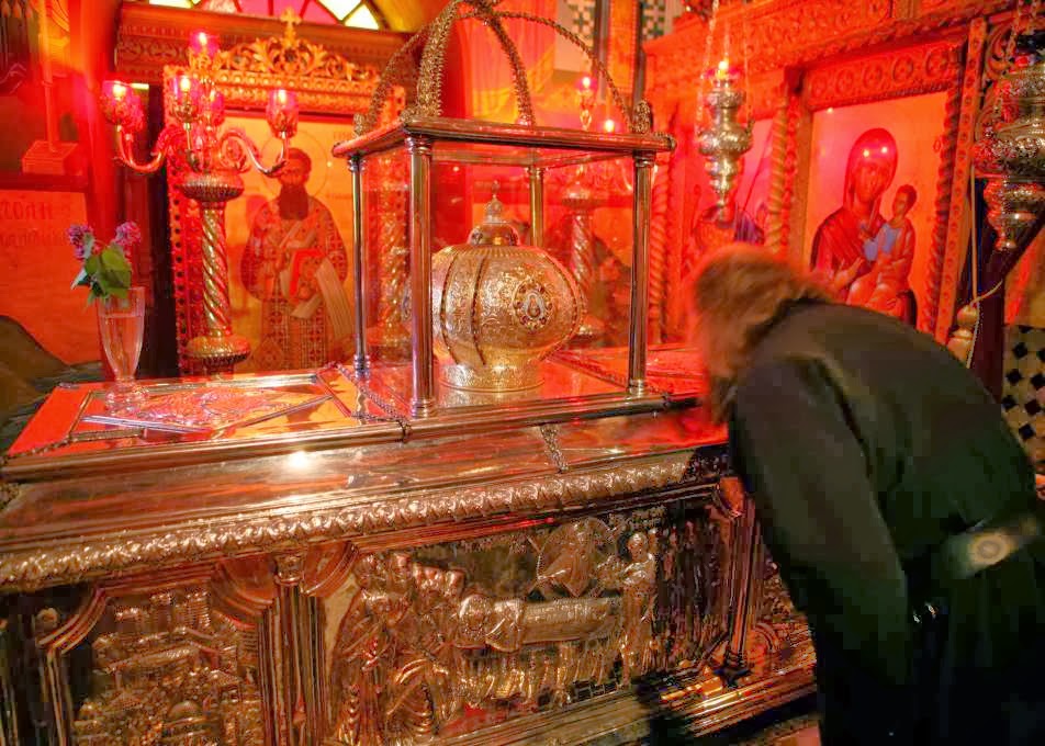 Мощи святителя Григория положены в красивую серебряную раку под сенью, справа от входа в храм…