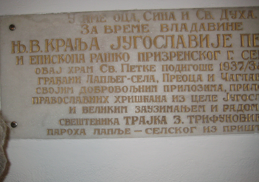 Чим се из Приштине попнете на брдо Ветерник, престају да вас окружују куће и зграде, а пут наставља да вас води низбрдо према Урошевцу и Скопљу. Поглед вам се губи у бескрај косовске равнице и бескрај плодних ораница. И како се спуштате низ Ветерник према Скопљу, поглед вам се, са леве стране пута, испуњава лепом сликом, а у њој доминира бела црква као изникла у пољу поред пута. То је црква Свете петке у Лапљем селу, које се наставља на село Чаглавица са кућама крај пута. Парохијани ове цркве су, поред Лапљег Села и Чаглавице, још и мештани села Преоце које се налази са друге стране пута...