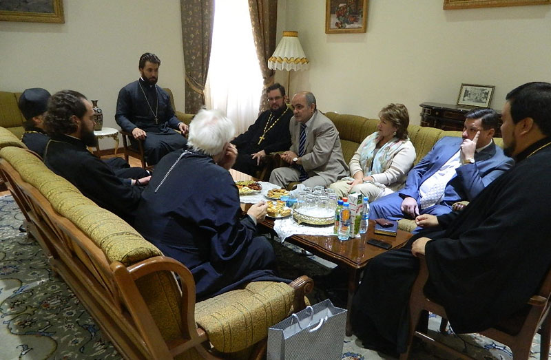 Делегация посетила Посольство России в Иране, где состоялась встреча с Чрезвычайным и Полномочным послом Л С. Джагаряном. На встрече присутствовал советник Посольства Д.В. Соболев. Архиепископ Феофилакт рассказал о программе предстоящего диалога с иранской стороной, а также ознакомил Л.С. Джагаряна с позицией Русской Православной Церкви по ряду актуальных вопросов, касающихся межрелигиозного диалога со странами исламского мира. Посол познакомил членов церковной делегации с деятельностью дипломатической миссии в Иране, поделился своим видением важных вопросов, связанных с российско-иранскими отношениями. Гости посетили расположенный в Посольстве исторический зал, где проходила встреча членов Тегеранской конференции 1943 года: И. Сталина, Т. Рузвельта и У. Черчилля.