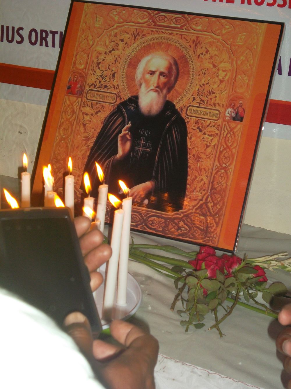 The faithful entered the place of worship holding banners and icons of Jesus, the Mother of God, and St. Sergius. During the procession the faithful chanted Psalms and the song of the Holy Theotokos. The faithful with great reverence and joy laid flowers and lit the candles to the icon of St. Sergius.