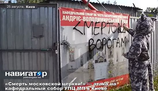 Группа молодых людей, большинство их которых были в кошачьих масках, изрисовала ограду храма надписями «Смерть врагам!», «Смерть московской церкви!».