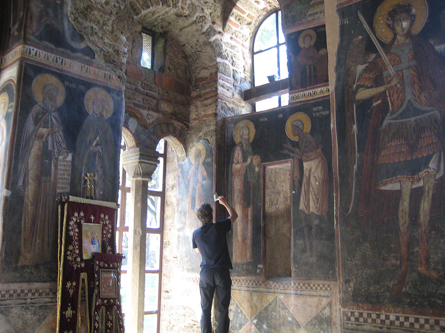 Посебни гости који су у манастиру радно провели готово два месеца су млади уметници из Београда. Они раде на конзервацији и презентацији фресака у манастиру Грачаница, спољне припрате. Министарство културе и информација финансира овај пројекат који обухвата рад на сто двадесет метара квадратних. Проблематика је различитог степена: од одвојених делова фрескомалтера, раслојавања малтера, крупних површинских оштећења, ослабљених делова сликане супстанце и депозитних наноса различитих својстава. Највећи посао је био на уклањању тамног талога од чађи произведеним дуговременим паљењем свећа у припрати, док је најсложенији део посла био инјектирање дубинских оштећења и уклањање окамењених беличастих депозита преко делова сликаног садржаја. Велики део посла урађен је и на преради и доради пломби, тј. попуњавања урађених у ранијим заштитарским радовима. Ослабљени делови сликарства- боје, ојачане су само местимично натапањем. Поред тога, ови млади уметници очистили су око 260 метара квадратних површине где није било живописа.