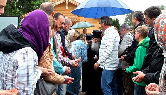 Архиепископ Феофан поздравил всех присутствующих с обретением нового прекрасного храма свв. Жен Мироносиц. Владыка отметил, что у православных в Гамбурге уже есть замечательный собор в центре города, который наполнен и любим. А теперь появился этот небольшой уютный деревянный храм в древне-русском стиле.