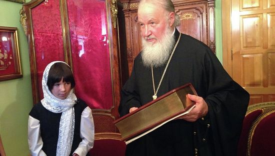 Святейший Патриарх Кирилл вручил Миле и ее родителям подарки, в том числе икону Христа Спасителя и Священное Писание.