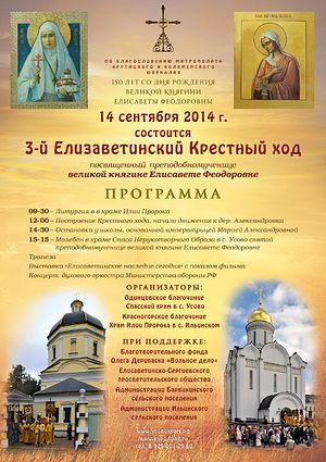 Елизаветинский Крестный ход традиционно приурочен к дате именин Великой княгини Елизаветы Федоровны. 18 сентября Русская Православная Церковь совершает память св. праведной Елисаветы, небесной покровительницы Великой княгини. В 1884 г., по преданию, именно в этот день, Великая княгиня Елизавета Федоровна впервые присутствовала на Литургии в храме Илии Пророка в родовом имении своего супруга Великого князя Сергия Александровича в Ильинском. В Ильинском супруги проводили лето, а к осени всем домом, торжественно, на плотах переплывая Москву-реку, перебирались в Усово, где был выстроен добротный зимний дом.
