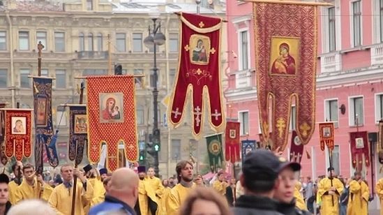 Ковчег с мощами небесного покровителя северной столицы был перенесен из собора крестным ходом на площадь Александра Невского, куда прибыл второй крестный ход от Казанского кафедрального собора.