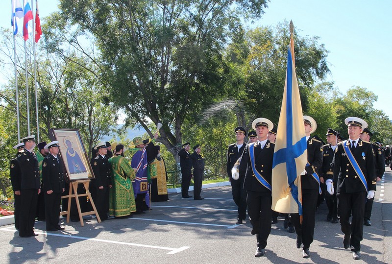 На плацу перед штабом икону встречал командующий вице-адмирал Мухаметшин Игорь Тимирбулатович и личный состав эскадры.