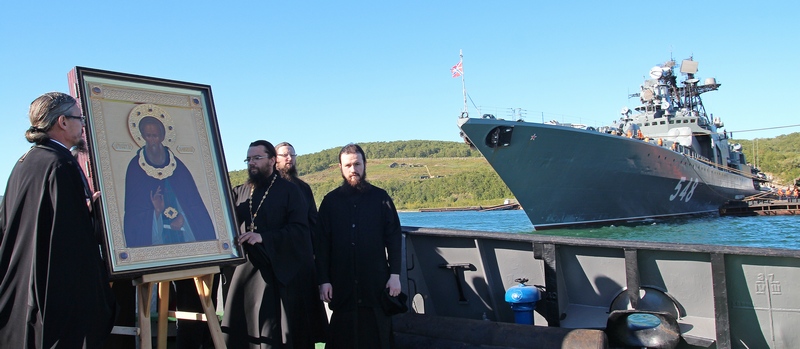 Чтобы у всех военных, которые несут боевое дежурство, была возможность видеть икону и получить благословение преподобного, образ на военном катере прошел по акватории бухты Крашенинникова, в которой базируются подводные лодки и боевые корабли.