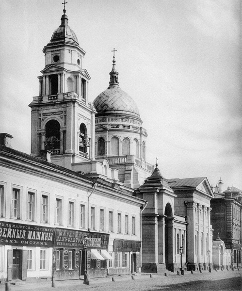 Церковь у Покровских ворот была сооружена в 1861 г. по проекту архитектора М. Д. Быковского на средства надворного советника Е. В. Молчанова. Ему предшествовали четыре более ранних каменных храма, а деревянная церковь с престолом Василия Кесарийского на этом месте известна с 1547 г.
