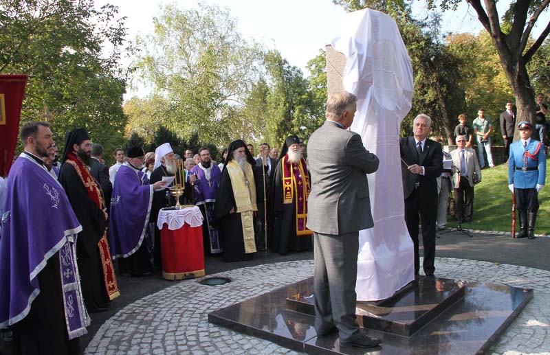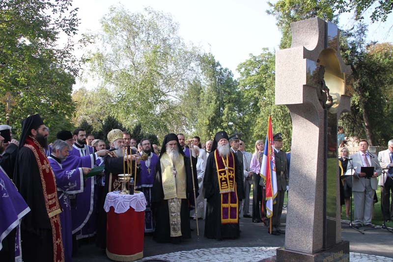 Његова Светост Патријарх српски г. Иринеј, уз саслужење Преосвећеног Епископа кронштатског г. Назарија, викара Митрополита санктпетерсбуршког и настојатеља Светотројицке лавре, и свштенства Архиепископије београдско-карловачке, освештао споменик који је израђен крстоликог облика на коме је изображен лик Светог великомученика Георгија Победоносца.