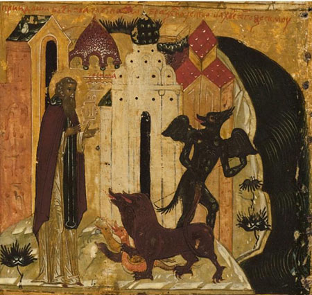 Преподобный Зосима Соловецкий изгоняет молитвами искушающих его бесов