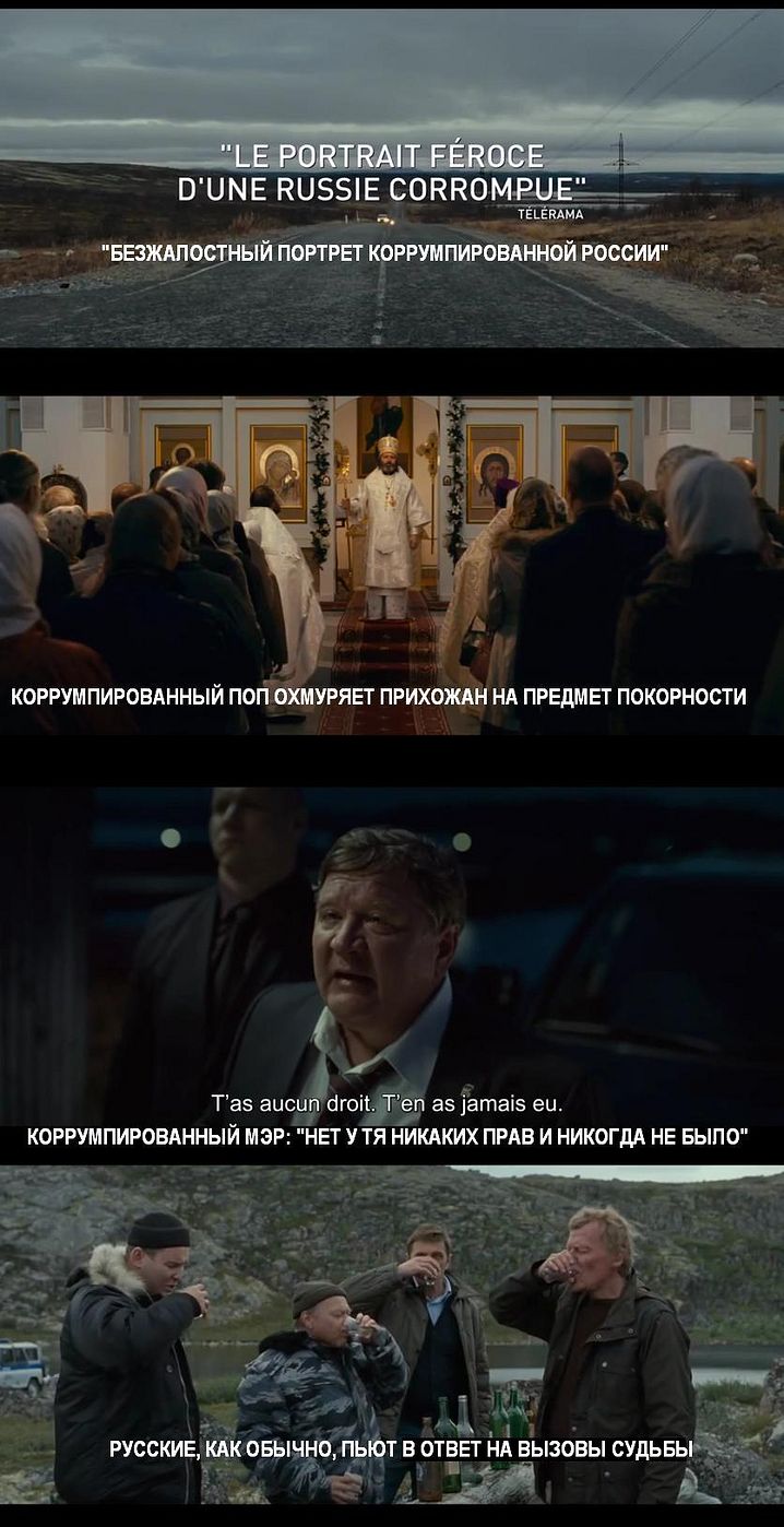 Если кому-то нужно более подробное изложение, то оно вот: на севере жил автомеханик Коля, бухая как не в себя. Коррумпированный мэр, бухая как не в себя, спихнул через суды его дом с живописного морского берега. Коля, бухая как не в себя, начал бороться за свои права. Все вокруг Коли бухают как не в себя и предают друг дружку, а раз в 20 минут на экране появляется поп и начинает призывать ко смирению, ибо всякая власть от Бога. В итоге Коля, собиравшийся всех покарать, так никого и не покарал. Его дом сносят, а на его месте строят коррумпированную церковь, где коррумпированный поп говорит коррумпированную проповедь коррумпированным чиновникам, под титры разъезжающимся в иномарках бухать как не в себя.