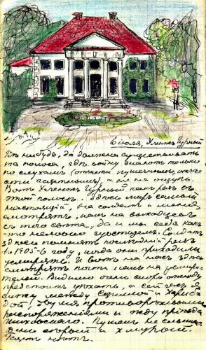 5 июля 1915 года. «По звуку определяю, что бой идёт в 30-40 верстах отсюда к югу… Поселился в каком-то пустом доме, видимо, в конторе с телефоном на столе. У помещика прелестный старый дом с колоннами, с высокой польской крышей». И здесь же – рисунок усадебного дома.