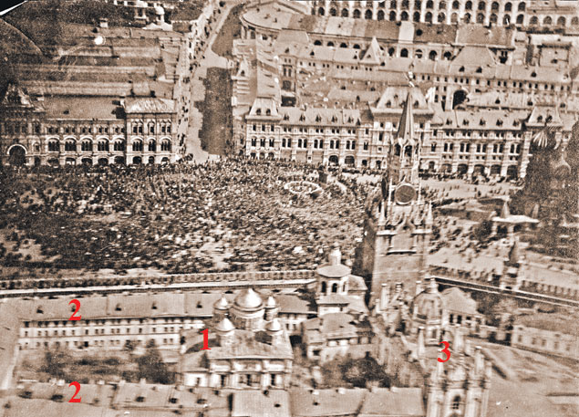 Так выглядела первая демонстрация на Красной площади в честь первой годовщины Великой Октябрьской социалистической революции. 1. Вознесенский собор, где находились гробницы русских цариц. 2. Сестринские кельи Вознесенского монастыря. 3. Церковь Святой Екатерины Вознесенского монастыря. Фото: КП