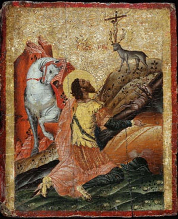 Even though by faith Placidas was an idolater, he showed himself to be a Christian in his manner of life: he fed the hungry, clothed the naked, helped those who had fallen into misfortune, and freed many who were fettered or imprisoned. He rejoiced more when he had occasion to do good to someone or to extend a helping hand to someone in distress than when he triumphed over his adversaries. He was like another Cornelius, of whom mention is made in the Acts of the Apostles.He was lacking only in the holy faith which is in our Lord Jesus Christ, without which every good work is dead. His virtuous wife, who had borne him two sons, was like him in all things. Placidas and his wife were kind and merciful to all, and they only lacked the knowledge of the one true God, Whom they honored unknowingly by their good deeds. God, however, Who loves mankind and desires that all be saved and Who looks upon those who do good, did not disregard this virtuous man and did not allow him to perish in the darkness of the deception of idolatry. Inasmuch as in every nation he that feareth Him, and worketh righteousness, is accepted with Him, the Lord was pleased to accept Placidas and to reveal to him the path to salvation. This occurred in the following manner. One day, as Placidas was hunting together with his servants, as was his custom, he came upon a herd of deer. Having pointed them out to the horsemen accompanying him, he set out in pursuit. Picking out the largest deer in the group, he chased after it, and the deer became separated from the herd. The servants followed Placidas, but their horses became exhausted, and they were left behind. Placidas, whose horse was the fastest, pursued the deer alone far into the wilderness. After he chased the deer for a long time, it climbed atop a great rock and stood there. Placidas drew near and looked at it, considering how he might take the deer. But the compassionate God, Who in various ways effects a man’s salvation and by means which He alone knows sets him upon the true path, ensnared the hunter. He manifested Himself, not through the agency of another as He did to Cornelius through Peter, but directly, as He did to Paul. Placidas remained for a long time gazing at the deer, and Christ the Lord appeared to him in a vision. A most radiant cross appeared between the deer’s antlers, and as Placidas gazed upon it, he beheld the likeness of Jesus Christ, Who was crucified for us. He was astonished by this strange vision, and he heard a voice saying to him, "Why do you pursue Me, 0 Placidas?"