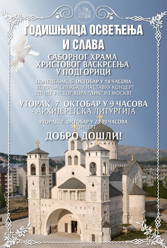 Прослава почиње у понедељак Вечерњом службом и мини-концертом руског дјечијег хора „Лик" из Москве, а наставља се светом архијерејском Литургијом у уторак у 9 часова и концертом нашег прослављеног музичара Сергеја Ћетковића у вечерњим сатима. О овим догађајима говори секретар подгоричког Саборног храма отац Мирчета Шљиванчанин.