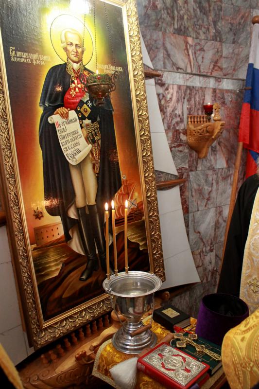 15 октября 2014 года, в день памяти святого праведного воина Феодора Ушакова, по установившейся традиции благочинный Севастопольского округа протоиерей Сергий Халюта совершил в сослужении духовенства, окормляющего корабли и части Черноморского флота, молебен перед иконой святого, находящейся в штабе флота России. Образ праведного воина Феодора с частицей мощей святого был принесен сюда будущим Патриархом Московским и всея Руси, а тогда — митрополитом Смоленским и Калининградским. Кириллом. За богослужением молились представители командования ЧФ РФ, члены Военного совета, ветераны флота, сообщает сайт Севастопольского благочиния.