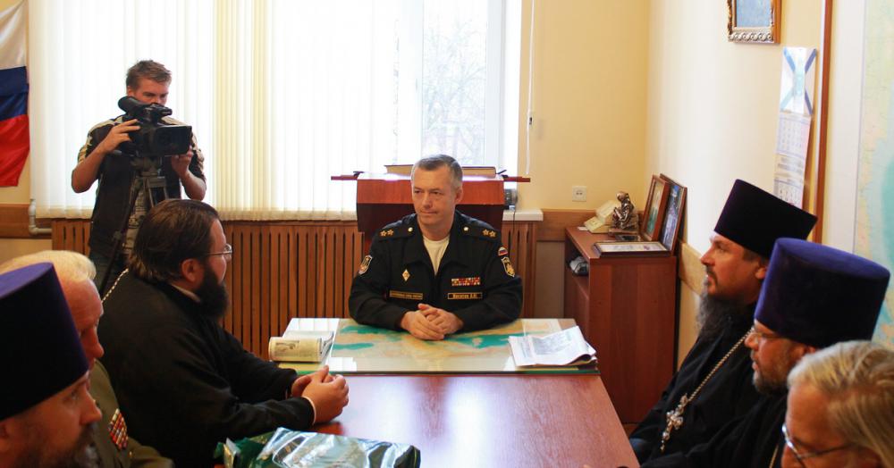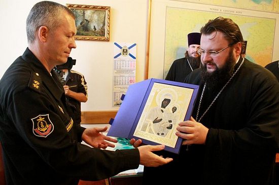 Комплект документов на походный храм начальнику штаба ЧФ, вице-адмиралу Александру Носатову вручил епископ Смоленский и Вяземский Исидор. Стороны также обменялись памятными подарками. Владыка передал в дар командованию флота список чудотворной Смоленской иконы Божией Матери, собщает сайт Севастопольского благочиния.