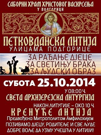 Митрополија црногорскоприморска организоваће у Подгорици, у суботу 25. октобра, Петковданску литију „за људски образ, икону божију, светињу брака и рађање дјеце”. Исти догађај организован је и прошле године након Параде поноса 20. октобра, када се Подгорицом шетало за црногорску част, образ, светињу брака и рађање дјеце, којој је присуствовало неколико хиљада вјерника, а након шетње поручено је да је литијом главни град очишћен од гријеха.