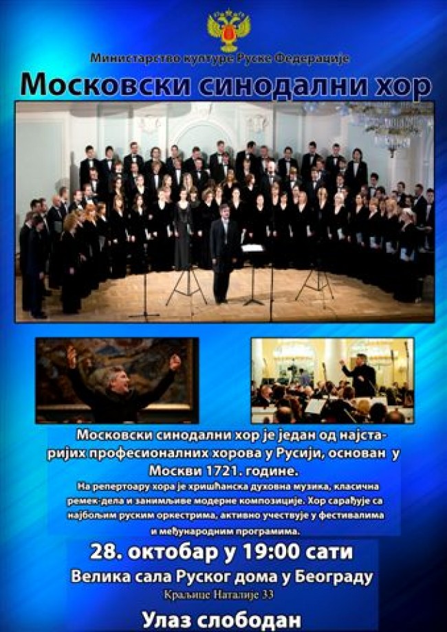 Концерт московског синодалног хора ће се одржати 28. октобра у 19:00 сати у Великој сали Руског дома