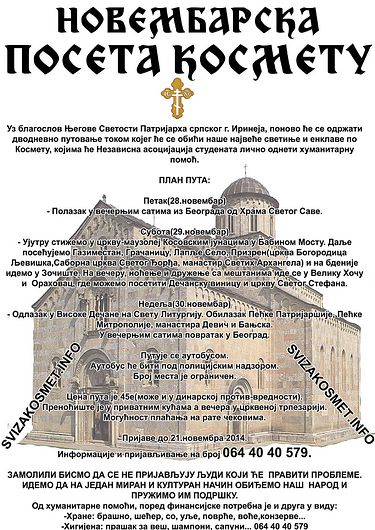Уз благослов Његове Светости Патријарха српског г. Иринеја, поново ће се одржати дводневно путовање током којег ће се обићи наше највеће светиње и енклаве по Космету, којима ће Независнa асоцијацијa студената лично однети хуманитарну помоћ.