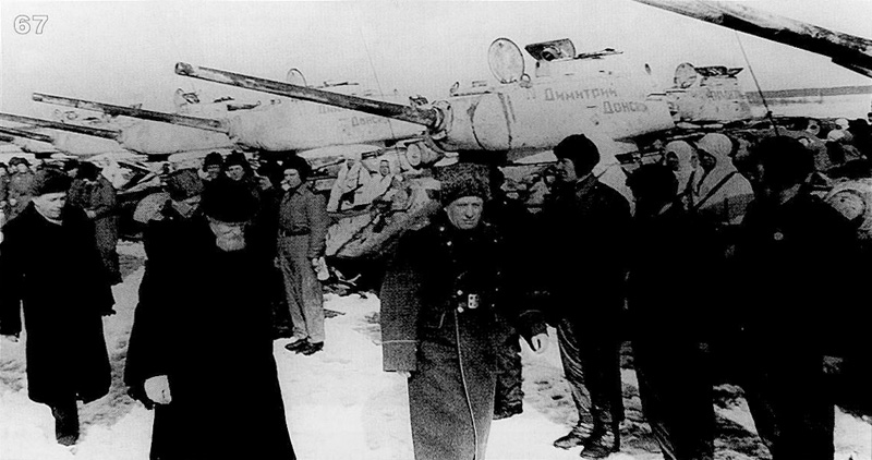 Передача личному составу 38-го отд. тп танковой колонны «Димитрий Донской», построенной на средства Русской Православной Церкви. Митрополит Крутицкий и коломенский Николай, генерал-лейтенант т/в Ф. Т. Ремизов и генерал-майор И. Г. Верков знакомятся с танкистами и устройством новых танков. 8 марта 1944 г. (фото из архива М. Коломийца)
