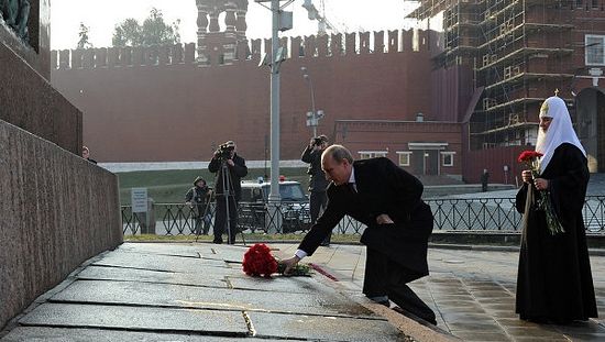 На Красной площади Святейший Патриарх Кирилл и Президент Владимир Путин возложили цветы к памятнику Кузьме Минину и Дмитрию Пожарскому. В церемонии возложения также приняли участие главы традиционных религиозных конфессий, представители студенческих строительных и военно-патриотических отрядов.