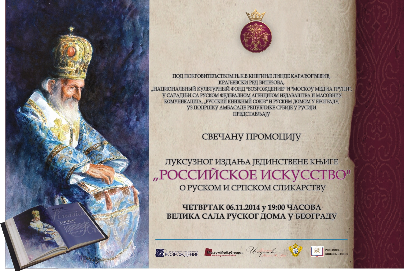 У четвртак 06.11.2014 у 19:00 часова, у Великој сали Руског дома у Београду биће одржана Свечана промоција луксузног издања јединствене књиге „РОССИЙСКОЕ ИСКУССТВО" о руском и српском сликарству.