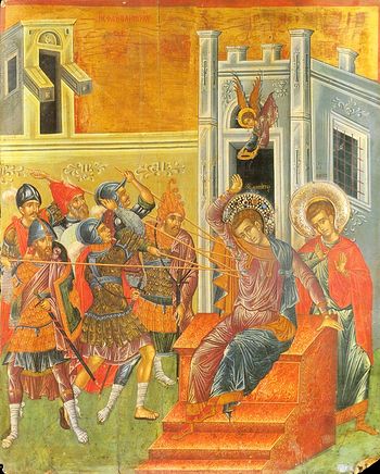 Тогда и он уверовал, и он исповедал Бога и крестился, а когда отец умер, стал градоначальником и удостоился от императора многих похвал и многих почестей. Но как только Димитрий получил власть над городом Фессалоники, он стал закрывать места, где собирались для поклонения идолам, и во всеуслышание проповедовал Бога истинного. Император, узнав об этом, послал сообщить ему, что приедет сам, чтобы произвести над ним суд и наказать его. Однако святой Димитрий не остановился, так же продолжал исповедовать Христа, укреплять места собраний христиан и обители, доселе тайные, и помогать им. И многих он обратил в веру, пока не прибыл император и не бросил его в темницу на истязания.