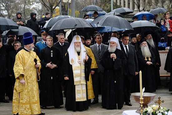 После прочтения молитвы и окропления памятника Святейший Патриарх Кирилл обратился к присутствующим с кратким словом, в котором, в частности, отметил: