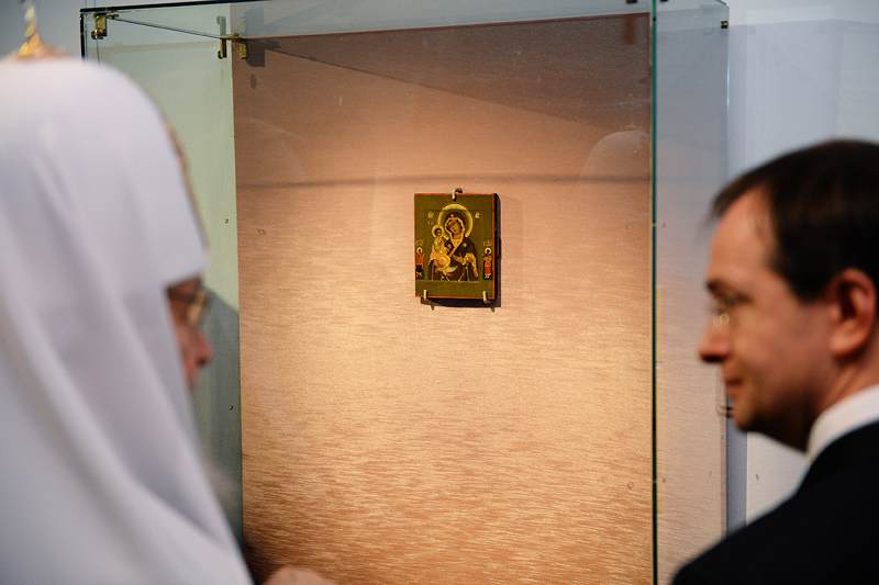 Свјатејши Патријарх Кирил је разгледао изложбу у пратњи министра културе Руске Федерације В. Р. Мединског, министра културе и информација Србије Ивана Тасовца и директора Државног архива Руске Федерације Ц.В. Мироненка.