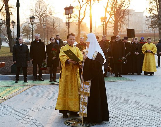 Святейший Патриарх Кирилл совершил чин освящения памятника. Пел хор Свято-Данилова монастыря, регент Георгий Сафонов.