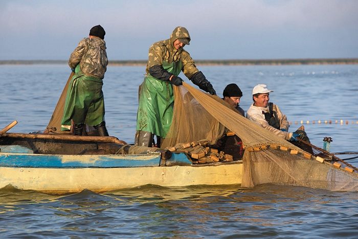 Когда рыбаки уже закинули первый невод и начали его выбирать, мы смогли подплыть и перебраться к ним в лодку. По трое на каждой корме они медленно тащат невод, рыбу собирают руками и перекидывают на дно лодки. Все в резиновых комбинезонах, спаянных с сапогами. Пахнет свежей рыбой.