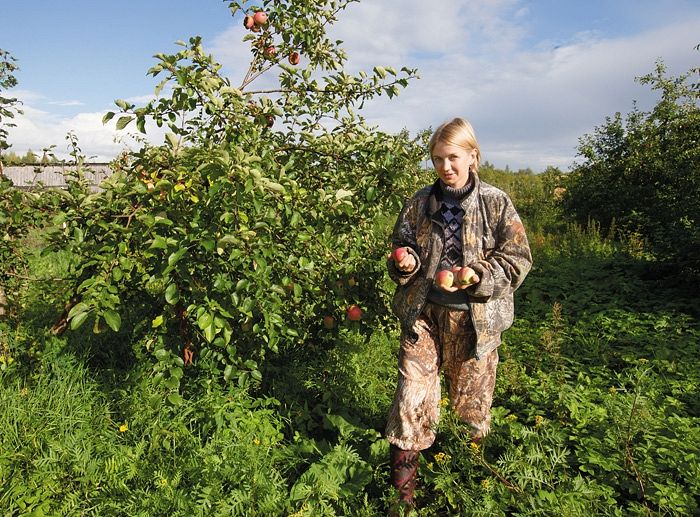На самом деле на большой территории рыбколхоза Катя, которая «больше ничего хорошего не делает», для себя и друзей выращивает поле картошки, длинные, уходящие в даль грядки кабачков, капусты, огурцов. Возродила заброшенный яблоневый сад, яблоньки стоят аккуратные, каждая манит своими плодами — белые, наливные, красно-багряные. Раньше еще стадо из 20 овечек было, но времени не хватало еще и за ними следить.