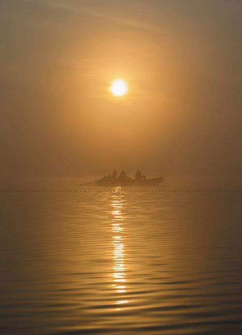 Очень медленно восходит солнце, и за каких-то два часа пейзаж меняется, постепенно темно-серый туман рассеивается, воздух становится прозрачным — и вот уже над головой синее небо и четко видна линия горизонта. А мы в очередной раз закидываем невод. Мокрые руки окоченели, но на это уже не обращаешь внимания.