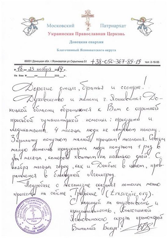 С большой благодарностью, благочинный Ясиноватского округа Донецкой епархии, протоиерей Виталий Бакун.
