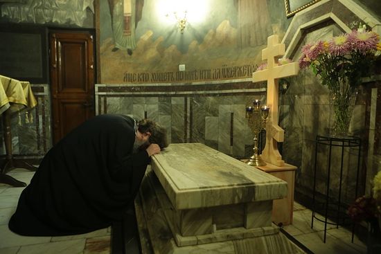 Митрополит Кирилл посетил Подворье Русской Православной Церкви, где совершил литию в крипте храма на месте упокоения архиепископа Богучарского Серафима (Соболева).