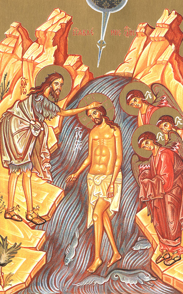 Prepare, O Zebulon, / and adorn yourself, O Naphtali; / River Jordan, cease flowing / and receive with joy the Master coming to be baptized. / Adam, rejoice with our First Mother / and do not hide yourself as you did of old in Paradise; / for having seen you naked, / He has appeared to clothe you with the first garment. / Christ has appeared to renew all creation.