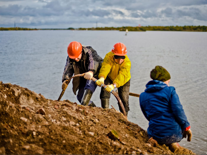 – Сначала не было ничего, кроме собственных рук и деревянных носилок. Не было даже лопаты. Все руками грузили, ссыпали, по цепочке передавали кирпичи. Как делать защитную конструкцию, мы узнавали методом проб и ошибок, изобретали на месте. Сначала сыпали все подряд под стены. Потом заметили, что кирпичная мелочь, оказывается, вымывается волной, и стали укладывать в дамбу обломки покрупнее. Весь материал на остров перевозили на лодке.